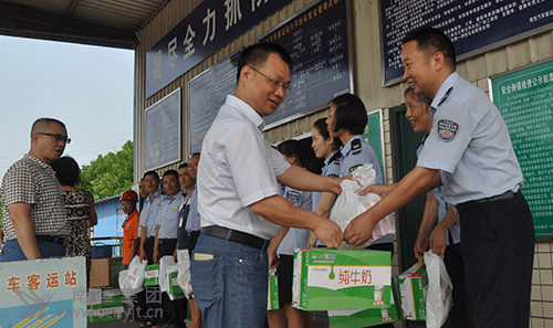 炎炎盛夏擋不住工會心系職工的匆匆腳步。8月12日,南充市總工會黨組書記、常務副主席官曉林一行,帶著市總工會的關愛和問候,在南運集團公司工會主席胡仕杰,工會副主席、女工委主任王燕,工會辦公室主任辜勤的陪同下,到南充汽車客運站,為炎炎夏日堅守在工作一線的職工送來了牛奶、茶葉、藥品等防暑降溫物品及毛巾、香皂等勞保用品。發放了《勞動法律法規知識問答》宣傳資料,讓職工們在炎熱的夏天感受到了陣陣清涼。 官曉林副主席一行在聽取了我公司夏季防暑降溫工作情況匯報后,來到職工中間,代表市總工會對炎熱高溫下戰斗在一線的職工表示了親切地慰問,希望大家做好安全運輸工作,做好防暑降溫工作,以良好的精神狀態服務好廣大旅客。隨后,官曉林副主席還親手將慰問品送到一線職工手中。市總工會領導的關心,使廣大職工倍受鼓舞,干勁十足,大家紛紛表示將以更加飽滿的熱情為旅客提供更加優質的出行服務。最后,官曉林副主席一行還實地檢查了“關愛”工程長虹空調使用情況。 (曹春麗 喬武林)