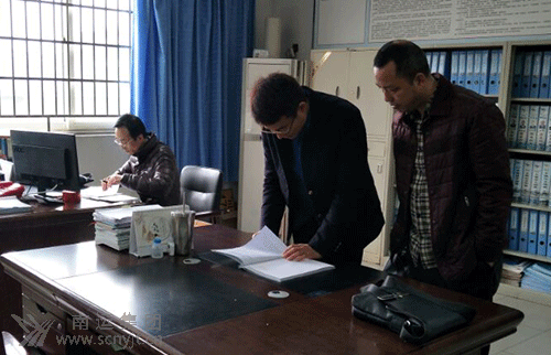 省運管局檢查組組長胡濤(中)查閱高速客運分公司有關安全資料