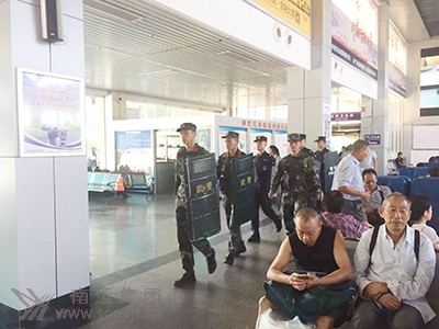 車站派出所公安干警和武警在候車大廳巡邏執勤