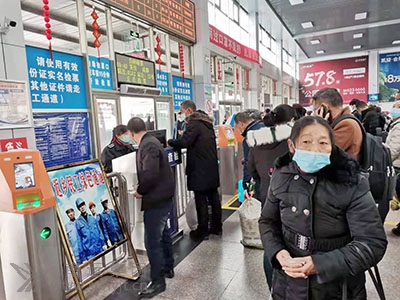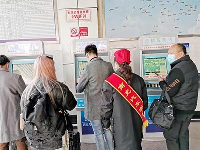 與以往熙熙攘攘、摩肩接踵的景象不同,空曠的售票大廳里,返崗的旅客掃碼、測溫、保持間距,喧囂不再,但一切井然有序。3個售票窗口有三三兩兩的旅客在購票。車站網(wǎng)上購票的旅客已增加到60%。在1名“小紅帽”站務人員的引導下,旅客們在10臺自助(售)取票機前便捷的取(購)票。另1個廣東、深圳、汕頭、福建、溫州的售票窗口基本上無人問津。為了方便農(nóng)民工回家返崗,車站專門設置了農(nóng)民工服務臺、農(nóng)民工優(yōu)先售票窗口和農(nóng)民工檢票進站綠色通道,車站工作人員熱情為農(nóng)民工提供指路、購票、咨詢、搬運行李、維護秩序等服務,深受農(nóng)民工歡迎。