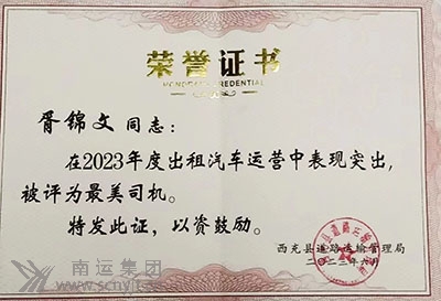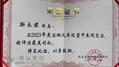 6月5日上午9時,“最美司機”頒獎儀式在西充縣道路運輸管理局舉行。南運集團西充分公司被西充縣道路運輸管理局授予“文明創建先進集體”稱號。同時,鴻運出租公司西充分公司駕駛員斯永君、胥錦文和西充宏達公交公司駕駛員李晏平等3名同志被授予西充縣“最美司機”稱號。 頒獎儀式上,南運集團鴻運出租西充分公司駕駛員胥錦文作為榮獲西充縣“最美司機”稱號代表發言,他說:“出租車駕駛員的行為舉止不僅體現行業的精神風貌,更是城市形象的代表。‘最美司機’這份沉甸甸的榮譽,我是代表全體駕駛員去受領的。我個人雖然在出租司機崗位上九年多,盡心盡責的為乘客服務,但離‘最美司機’的光榮稱號,還有很大差距。我決心以這次表彰會為加油站新起點,今后更加嚴格的要求自己,加強政治學習,不斷提高職業素養,以更高標準做好乘客的安全和服務工作,起到排頭兵的作用”。 西充分公司分管出租、公交副經理馮興晏表示,要進一步加強精神文明創建工作,認真貫徹落實表彰會的要求,以西充縣創建第六屆四川省文明城市為契機,以服務質量提升行動為抓手,加強營運駕駛員思想道德建設,弘揚主旋律、傳播正能量、樹立文明新風尚,營造“愛國、敬業、誠信、友善”的良好氛圍,展現出南運人的靚麗風采! (西充分公司 謝丹)