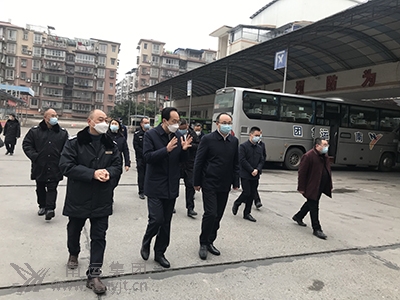 西充縣委書記張光全(左三)、西充縣委副書記、縣長鄧強(左二)深入西充汽車客運中心檢查春運安全生產工作。