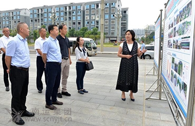 營山縣副縣長楊素梅(左一)在營山汽車客運站站前廣場的展板前,向寧堅一行介紹營山12328助力脫貧攻堅工作開展情況。