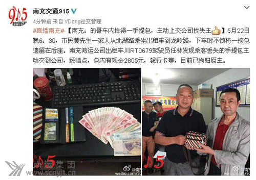 5月22日晚6:30,市民黃先生一家從北湖路乘坐出租車到龍吟路,下車時不慎將一挎包遺留在后座。南運集團南充鴻運出租汽車川RT0679駕駛員任林發現后,主動將乘客遺失的挎包交到公司,經公司管理人員當面清點,包內有現金2805.00元,已及銀行卡等。經多方聯系后,乘客遺失財物已物歸原主。