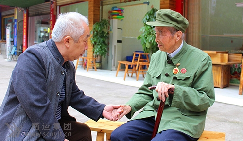 南運集團高坪分公司退休職工夏則鳴(右一)和唐德民拉家常