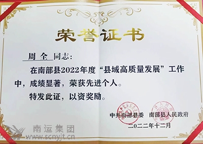 南部分公司黨總支書記、經理周全榮獲 “南部縣2022年度‘縣域高質量發展’工作先進個人”等稱號