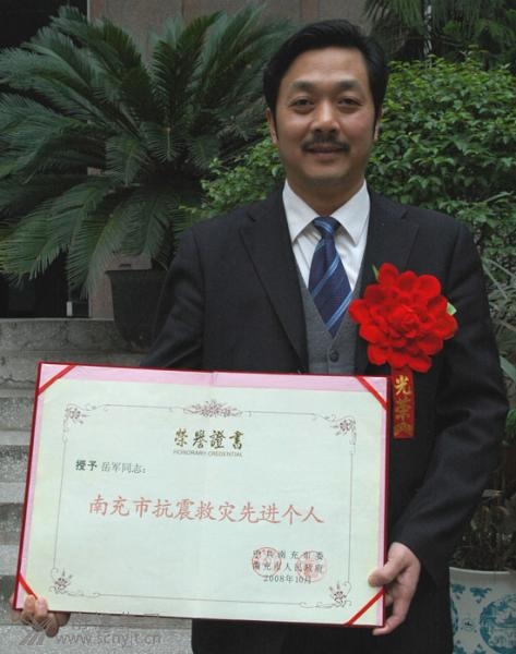 圖為藍光公司經理岳軍被市委、市政府授予“南充市抗震救災先進個人”稱號