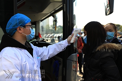 醫(yī)務(wù)人員為返崗務(wù)工人員檢測體溫